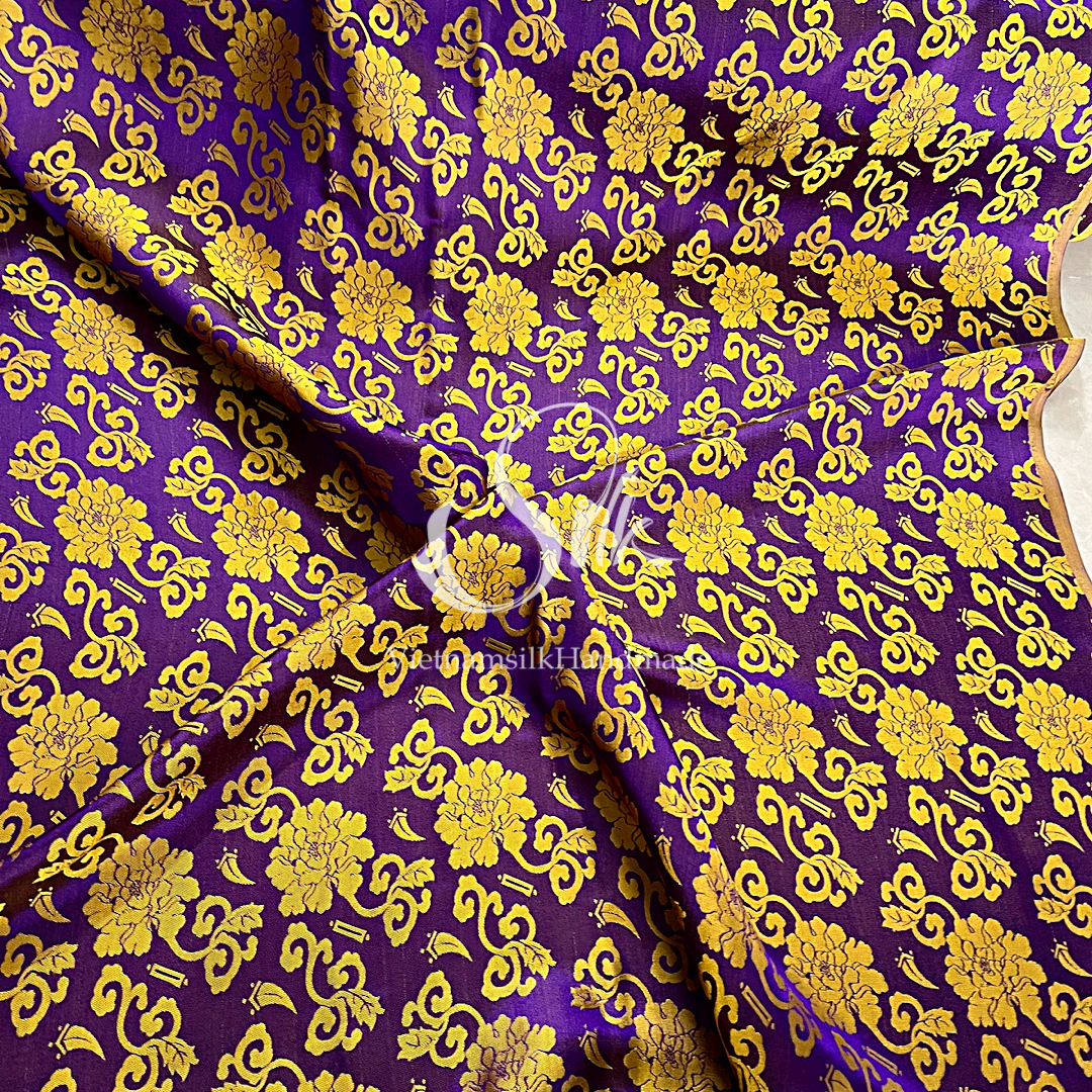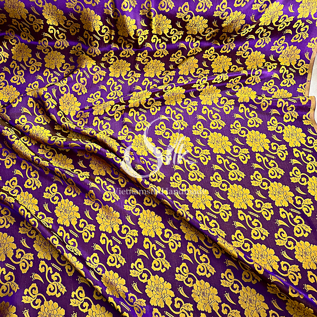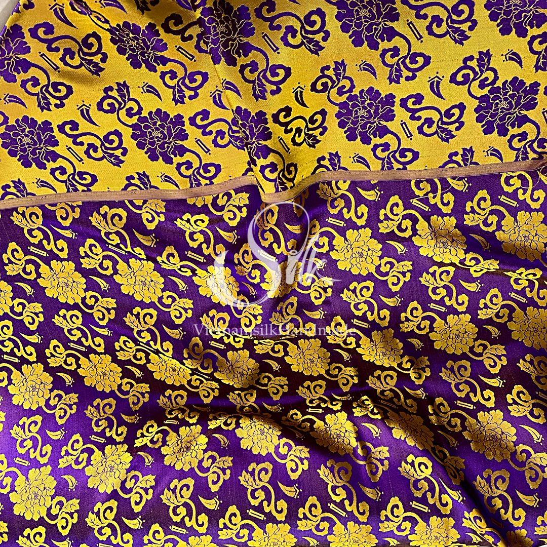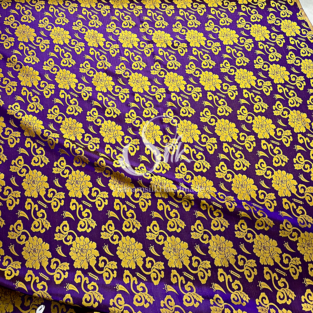Purple Silk with Yellow Flowers - PURE MULBERRY SILK fabric by the yard - Floral Silk -Luxury Silk - Natural silk - Handmade in VietNam- Silk with Design