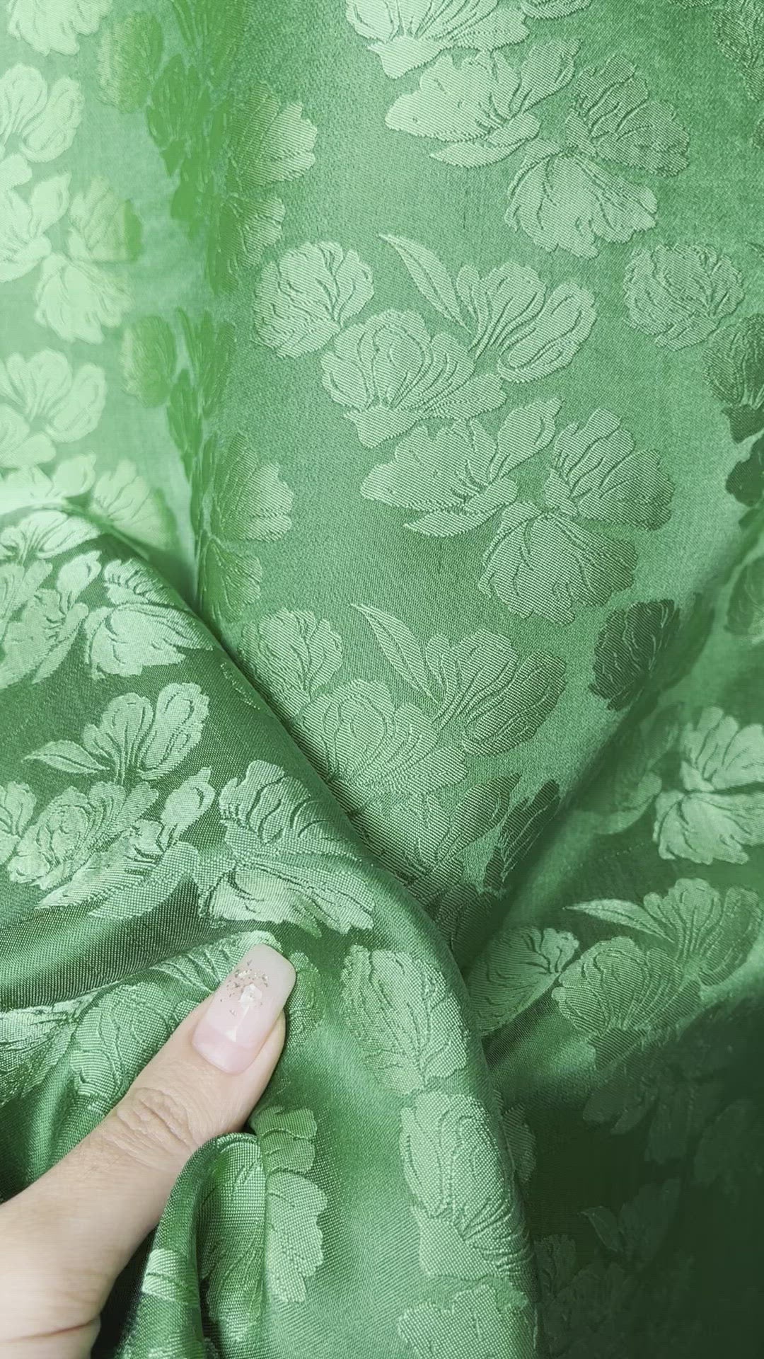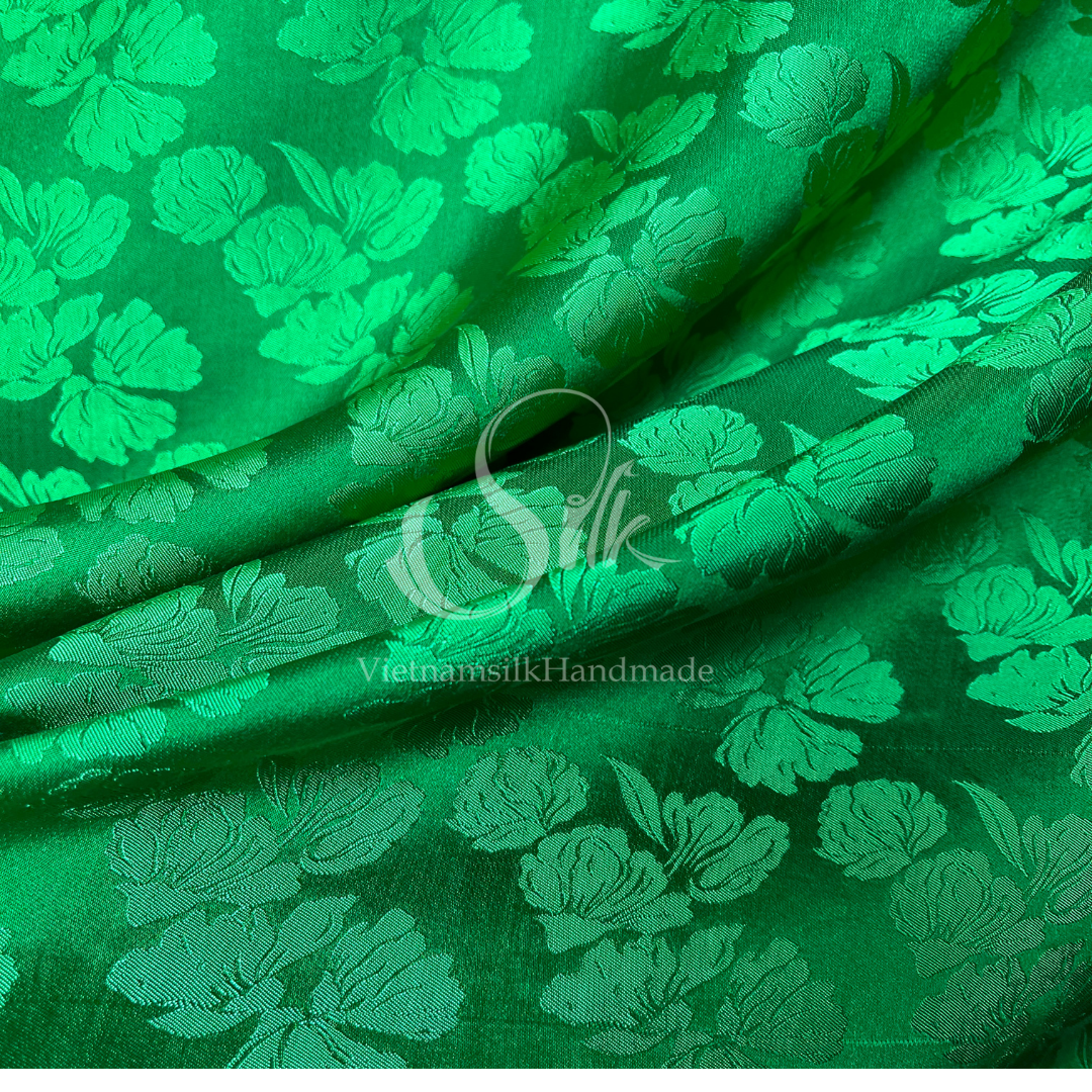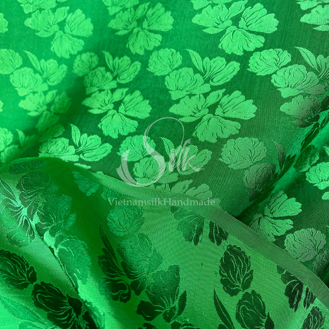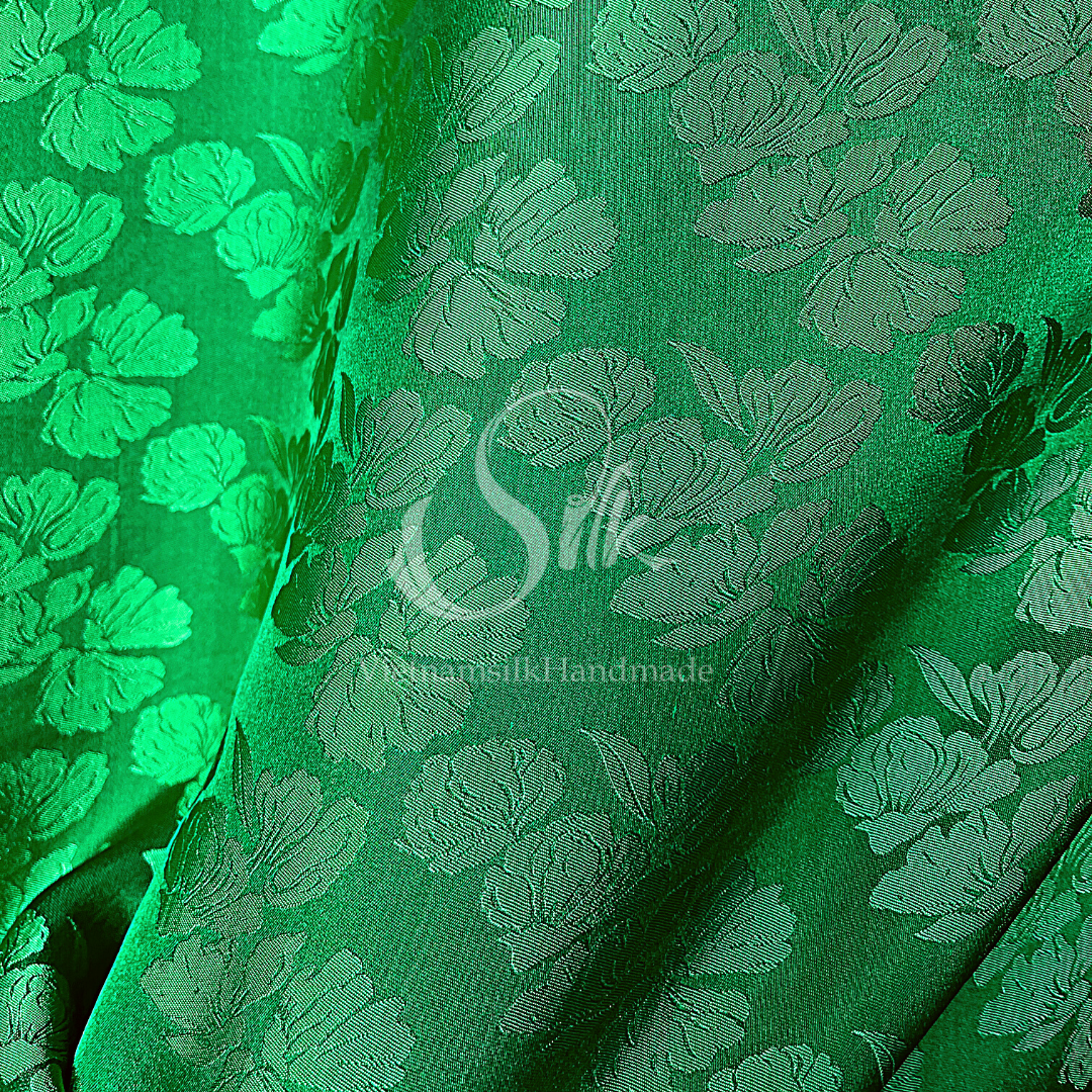 Green Silk with Big Flowers - PURE MULBERRY SILK fabric by the yard - Floral Silk -Luxury Silk - Natural silk - Handmade in VietNam- Silk with Design