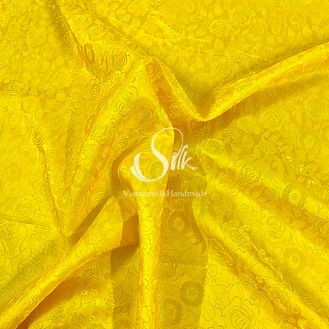 Yellow Silk with Rose Flowers - Rose Pattern - PURE MULBERRY SILK fabric by the yard - Floral Silk - Rose Silk -Luxury Silk - Natural silk - Handmade in VietNam- Silk with Design