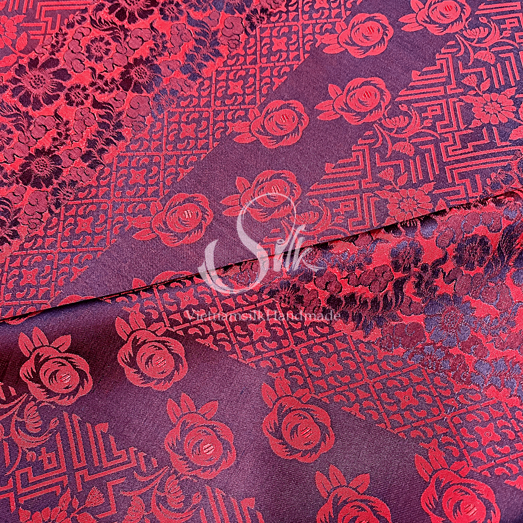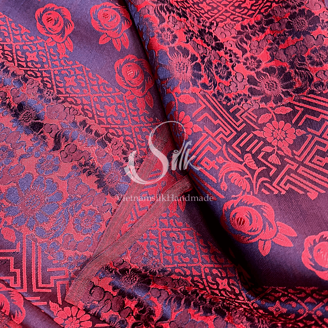 Red Silk with Mixed Flowers - PURE MULBERRY SILK fabric by the yard - Floral Silk -Luxury Silk - Natural silk - Handmade in VietNam- Silk with Design