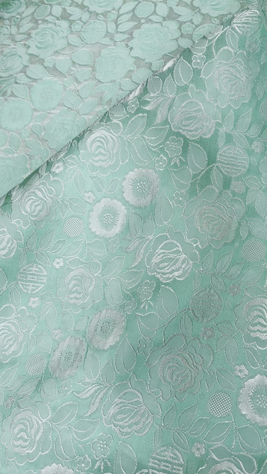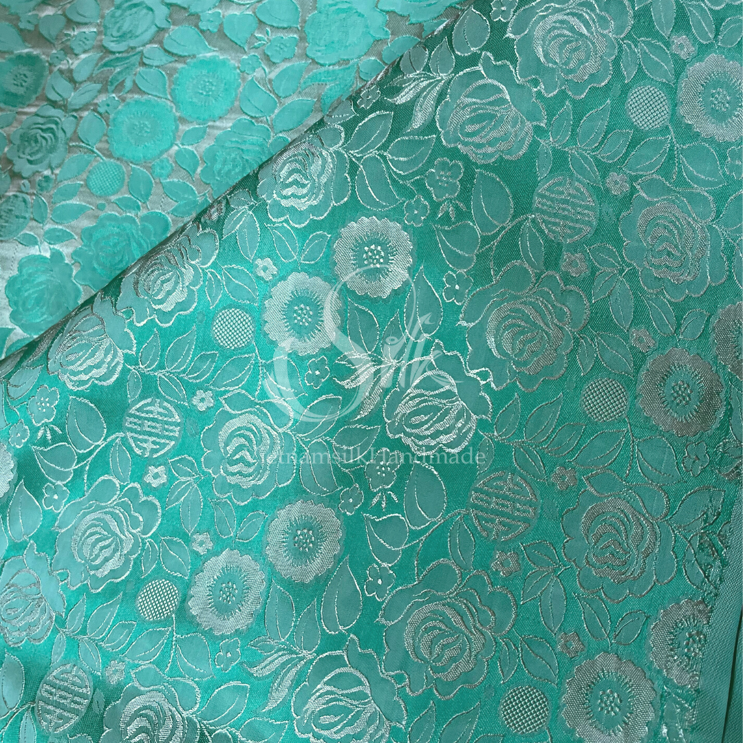 Turquoise Green Silk with Flowers - PURE MULBERRY SILK fabric by the yard - Floral Silk - Rose Silk -Luxury Silk - Natural silk - Handmade in VietNam