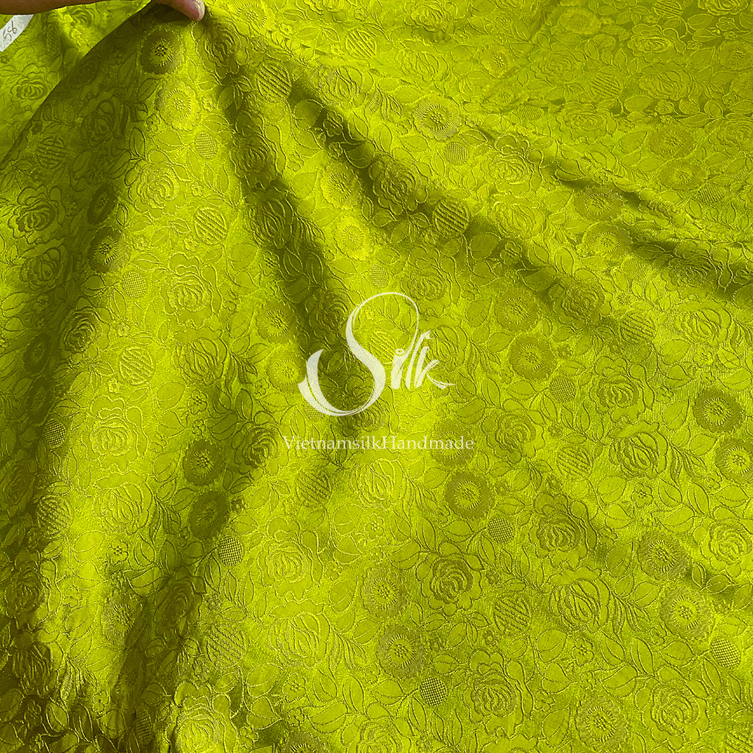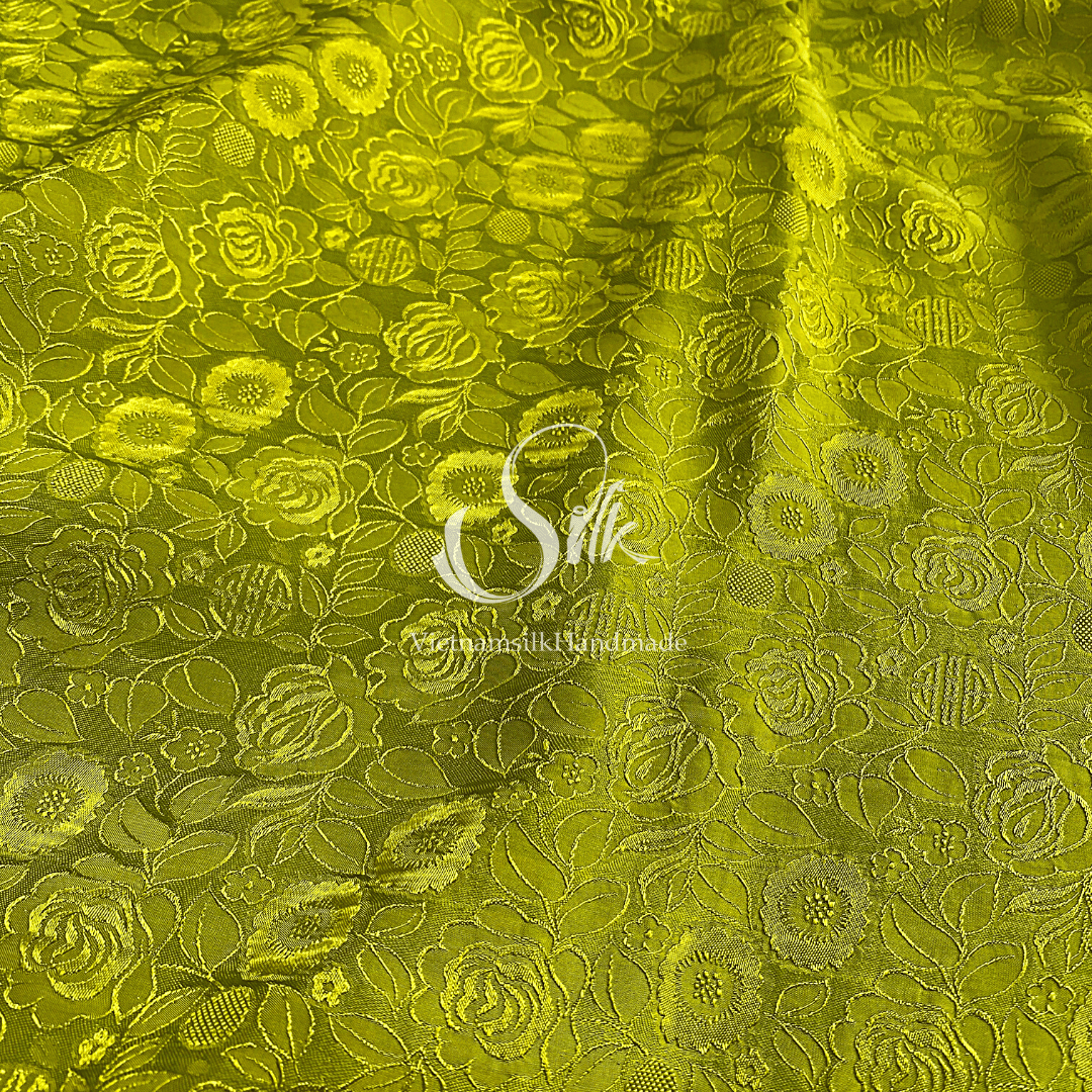 Chartreuse Silk with Rose Flowers - Rose Pattern - PURE MULBERRY SILK fabric by the yard - Floral Silk - Rose Silk -Luxury Silk - Natural silk - Handmade in VietNam- Silk with Design