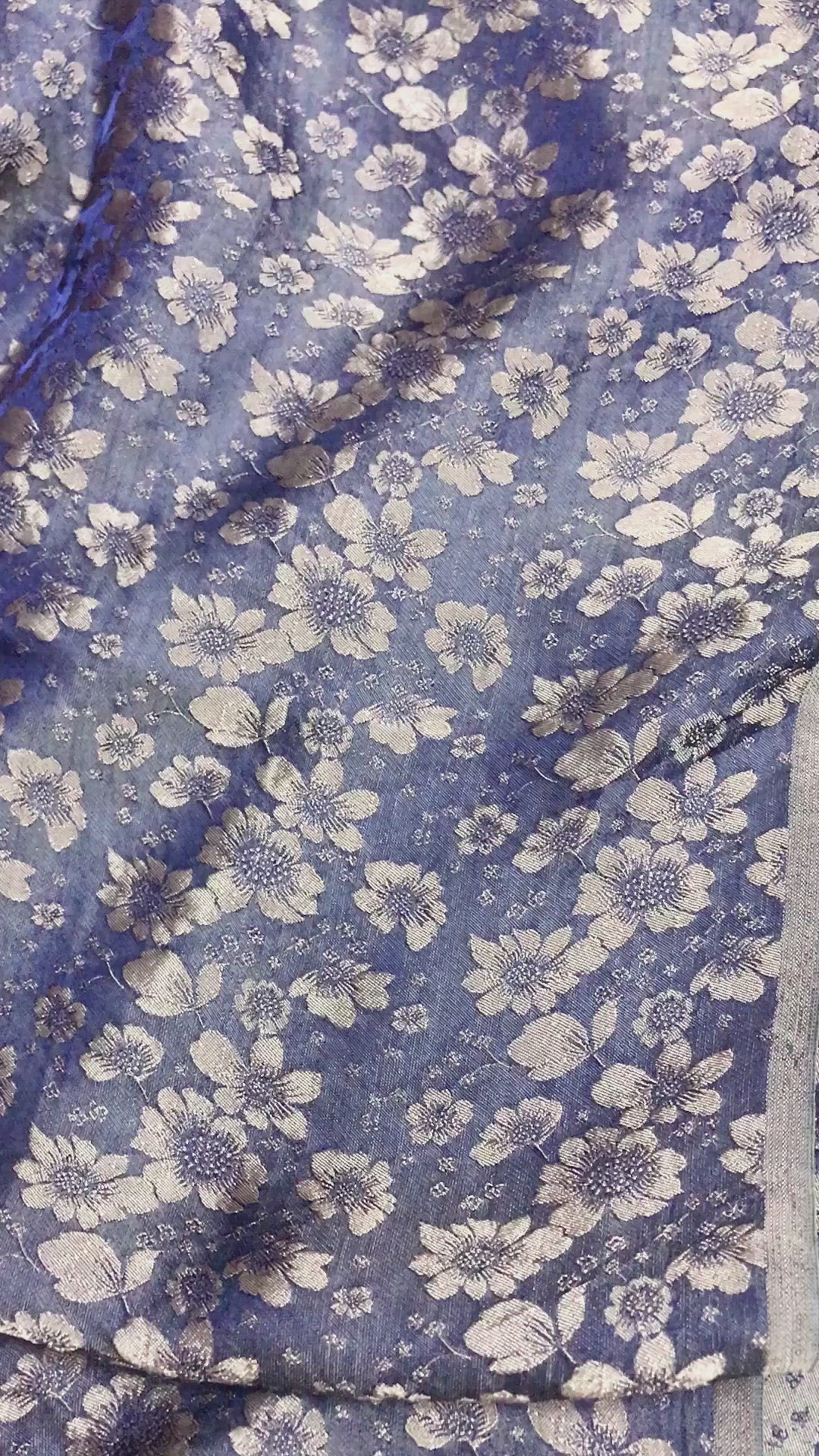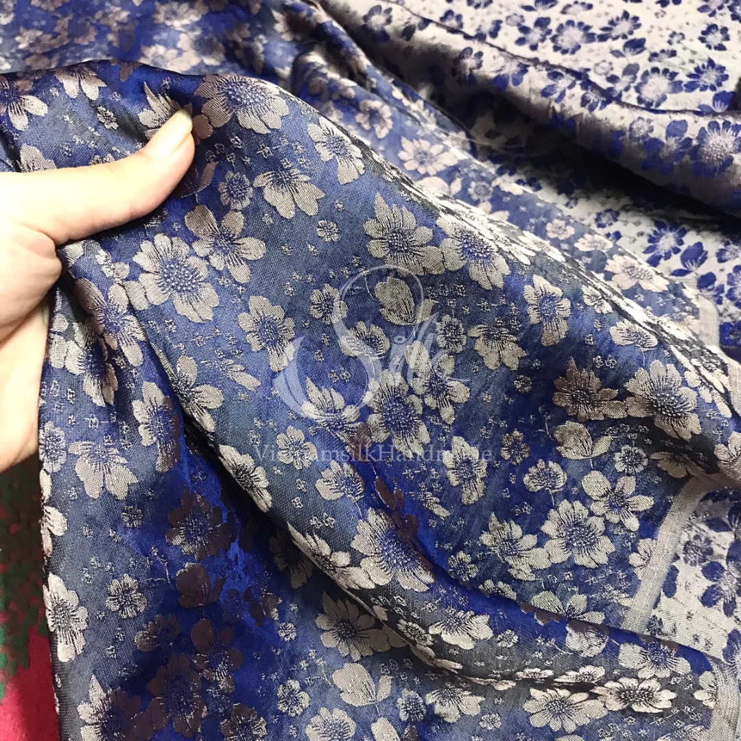 Grey flowers on Navy silk - PURE MULBERRY SILK fabric by the yard - Denim silk with flowers - Floral Silk -Luxury Silk - Natural silk - Handmade in VietNam