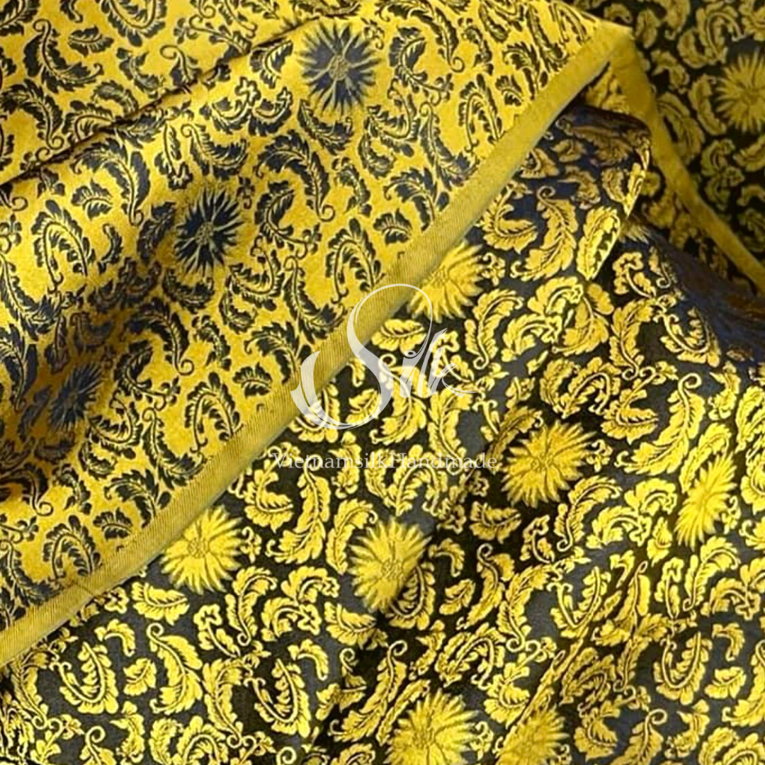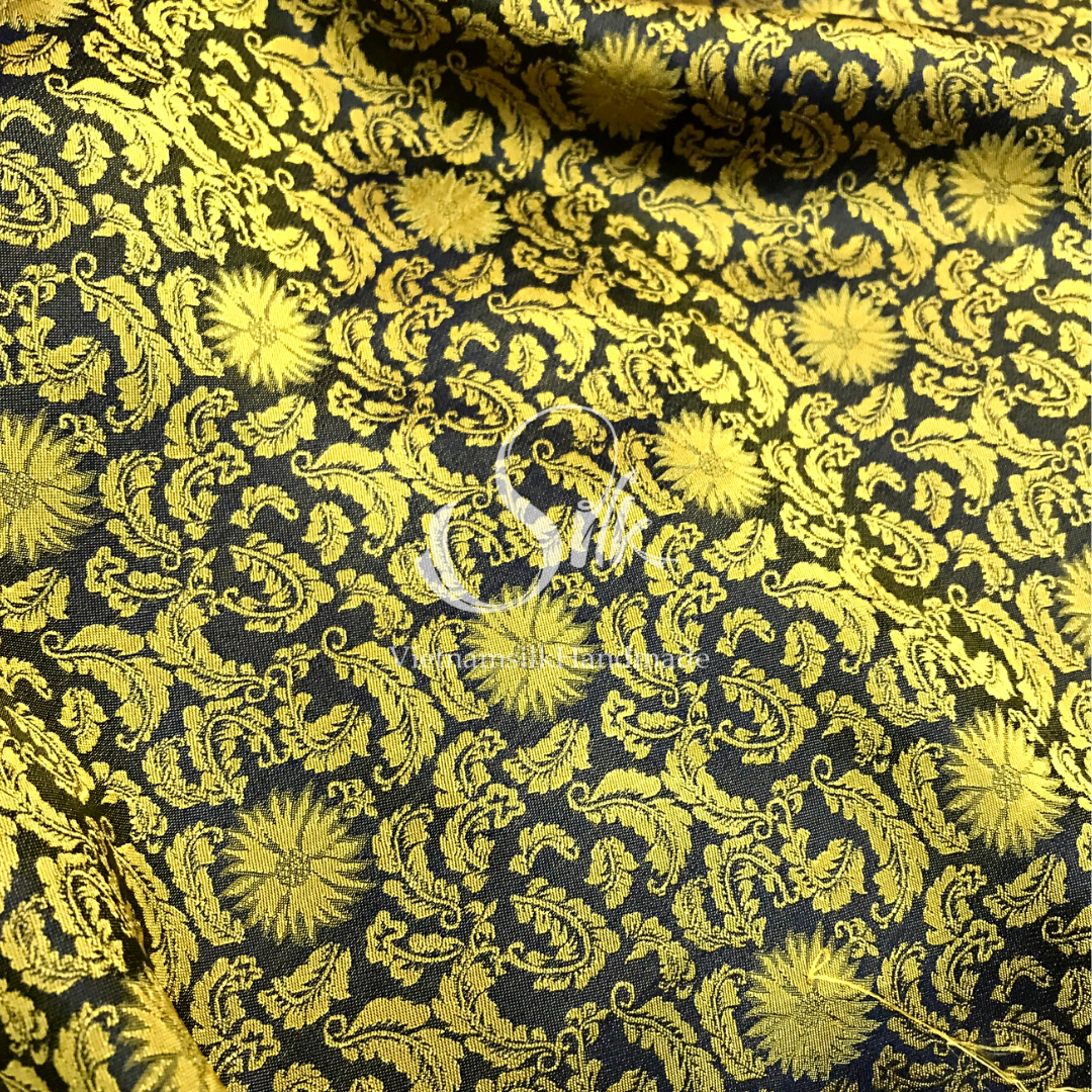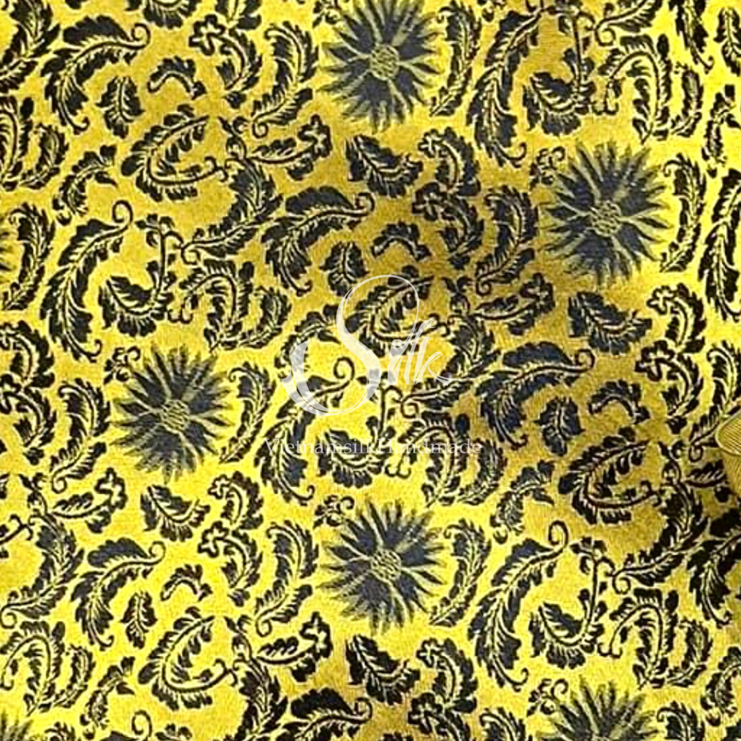 Yellow Silk with Black Flowers - PURE MULBERRY SILK fabric by the yard - Floral Silk -Luxury Silk - Natural silk - Handmade in VietNam