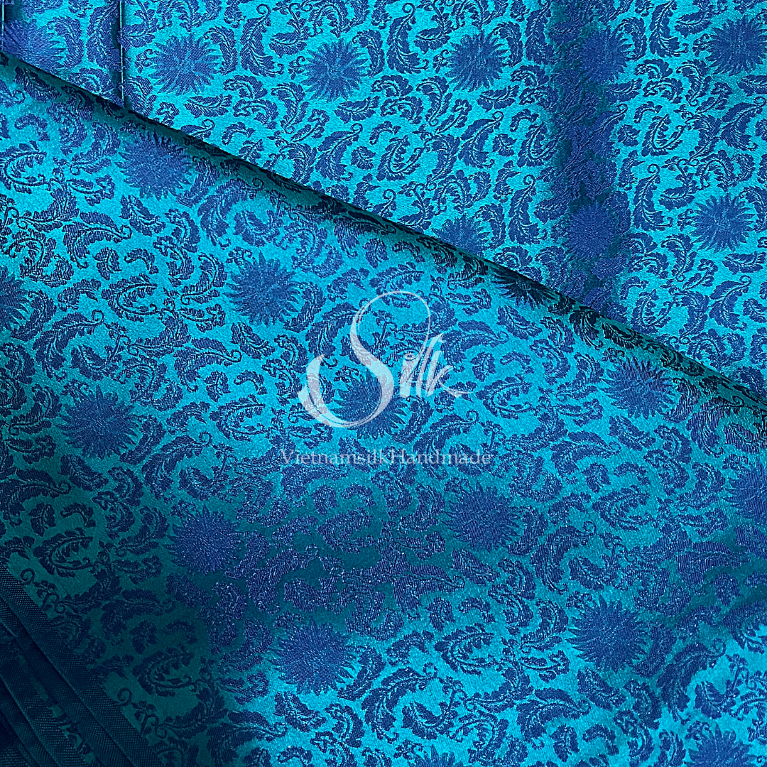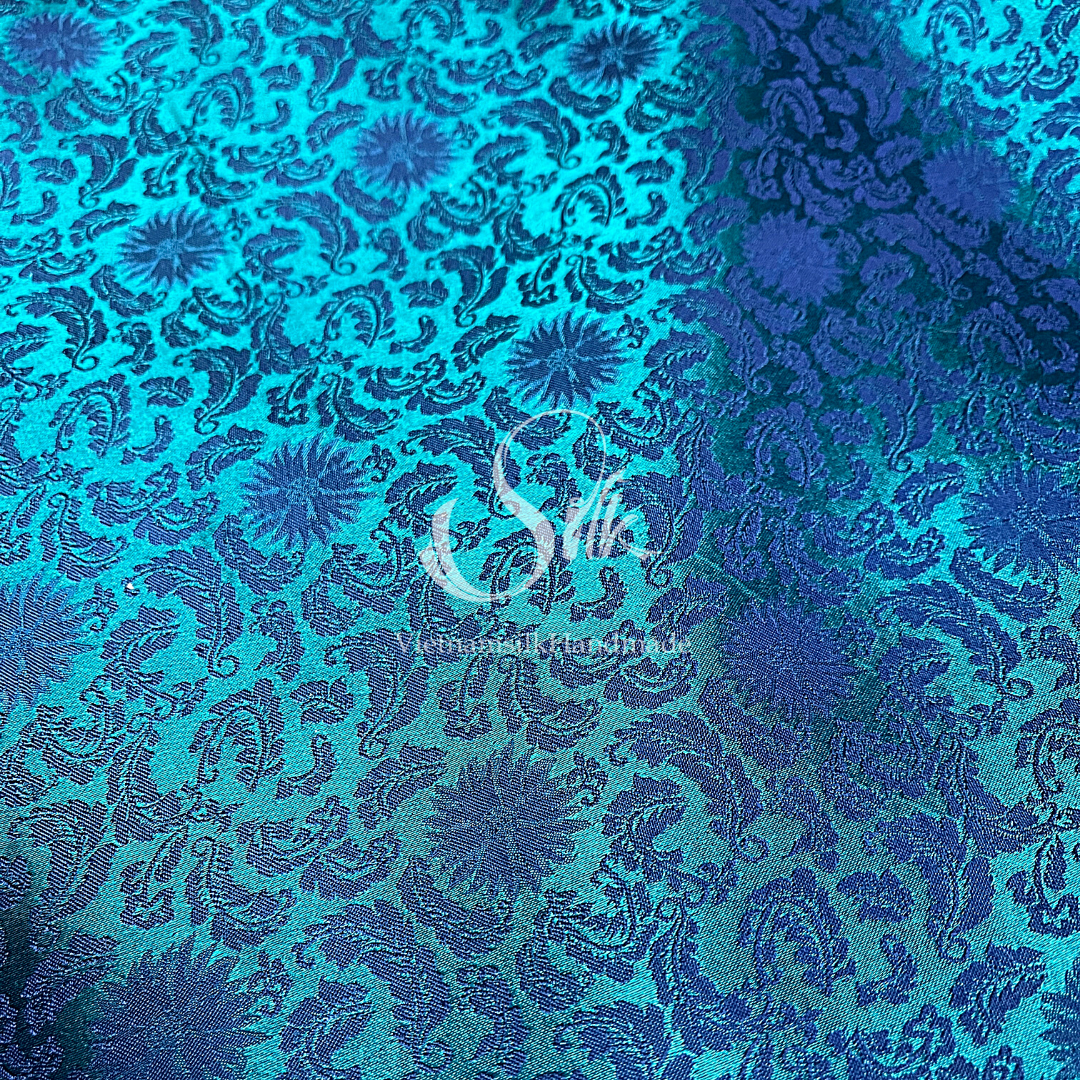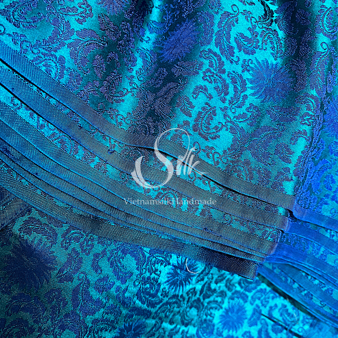 Mallard Green and Peacock Blue Silk with Flowers - PURE MULBERRY SILK fabric by the yard - Floral Silk -Luxury Silk - Natural silk - Handmade in VietNam