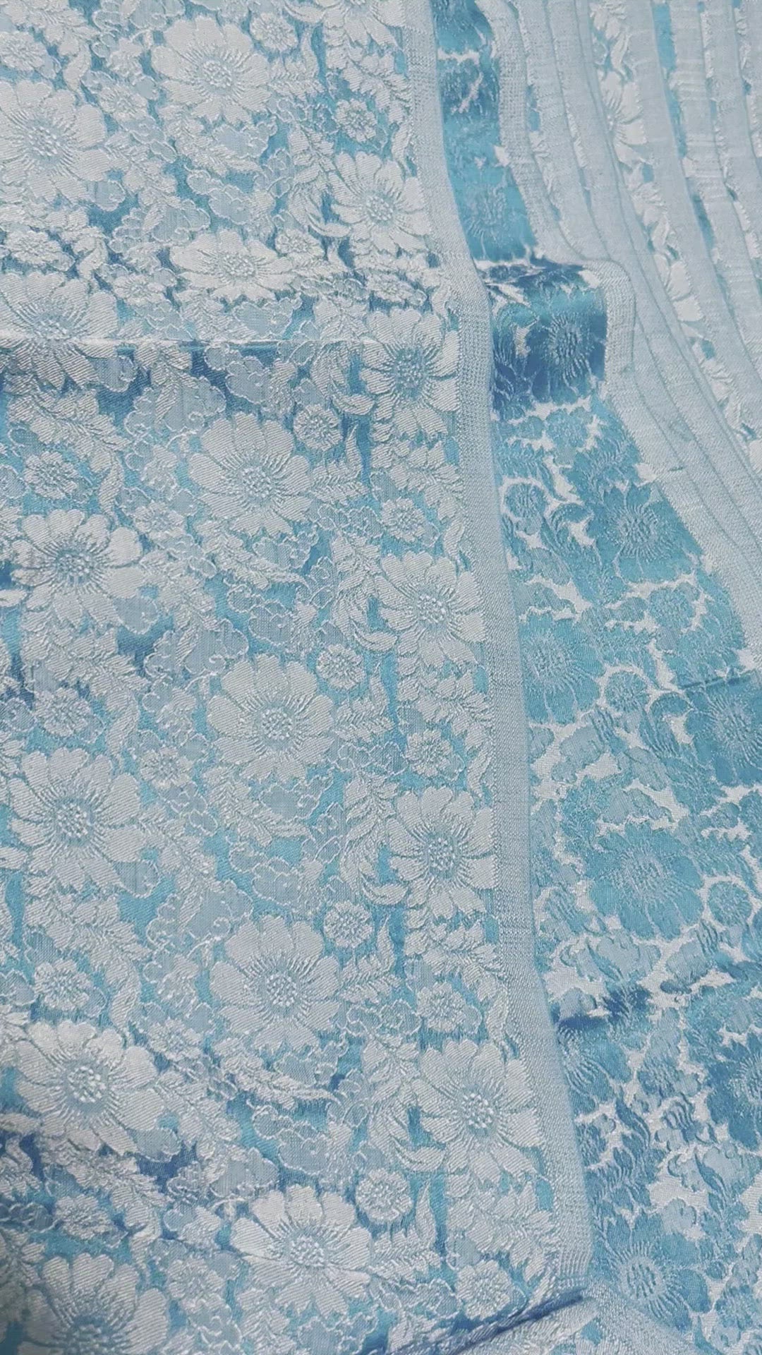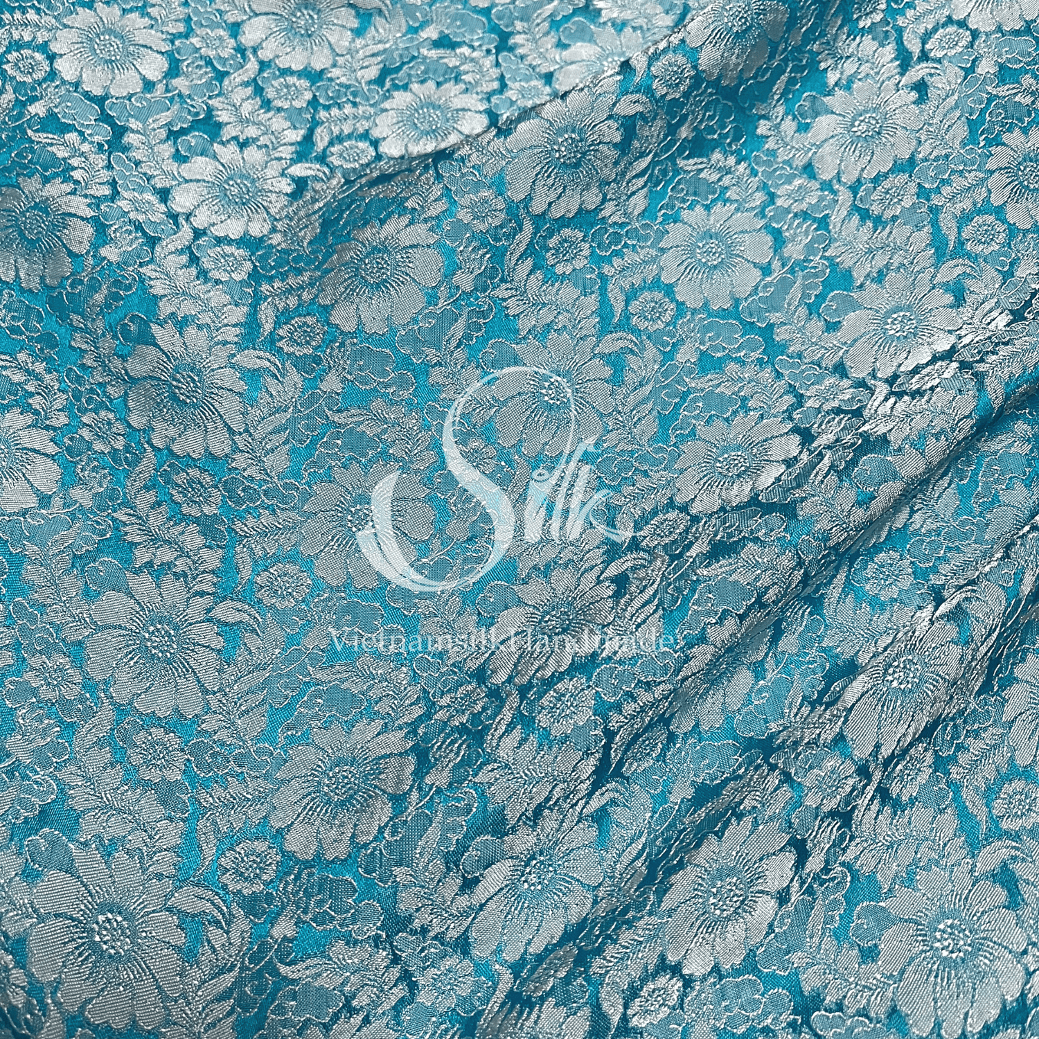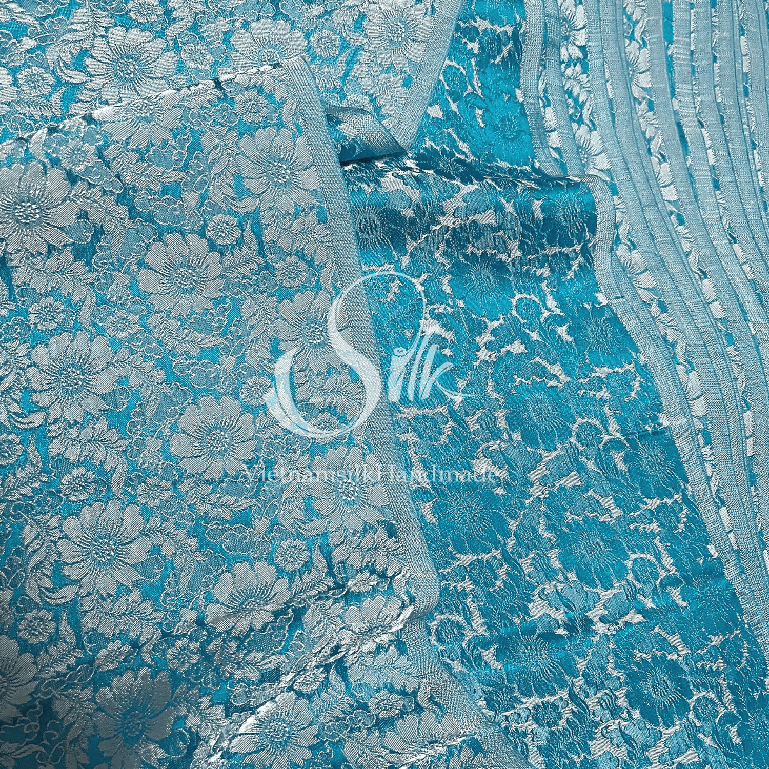Blue Silk with Daisy Flowers -PURE MULBERRY SILK fabric by the yard - Floral Silk -Luxury Silk - Natural silk - Handmade in VietNam- Silk with Design