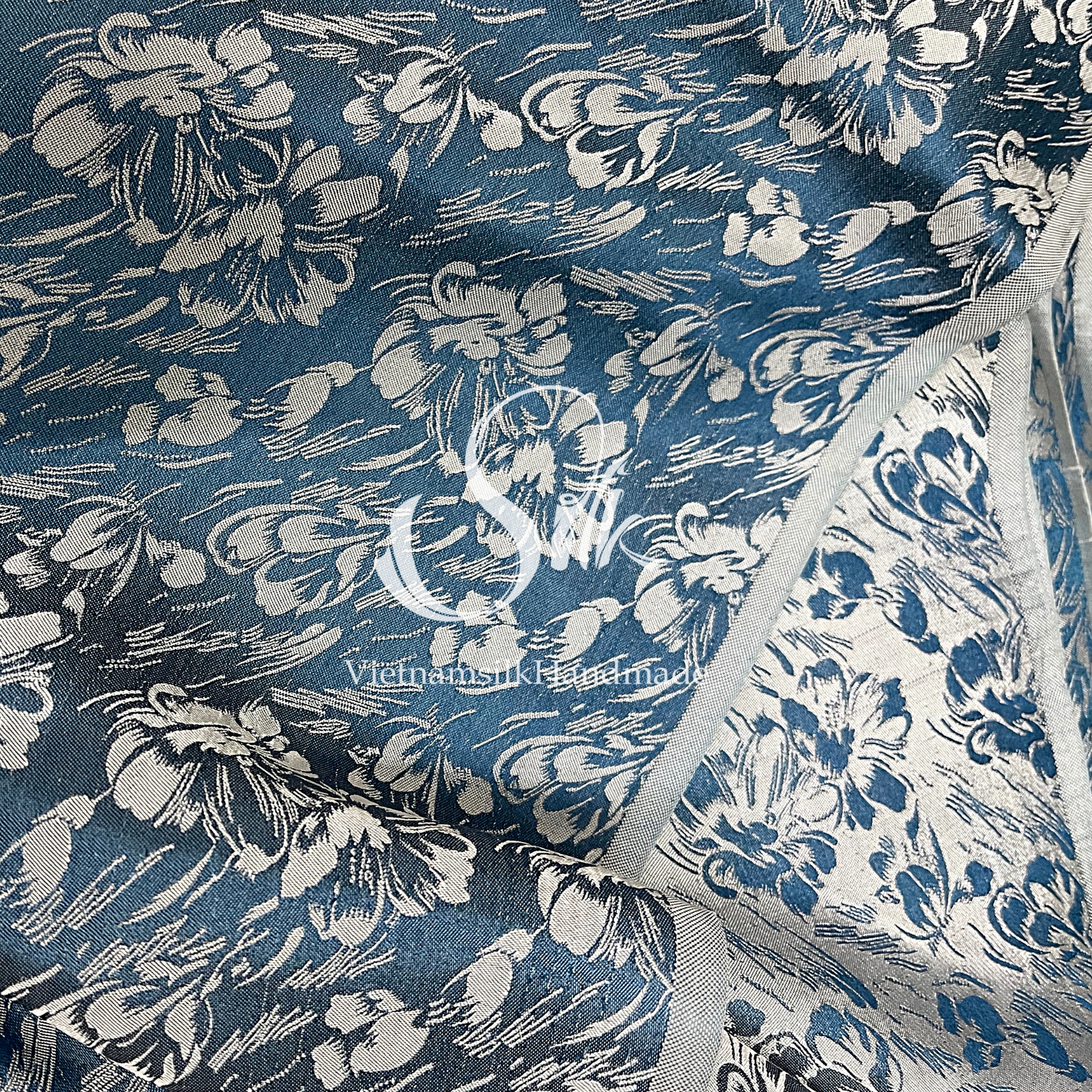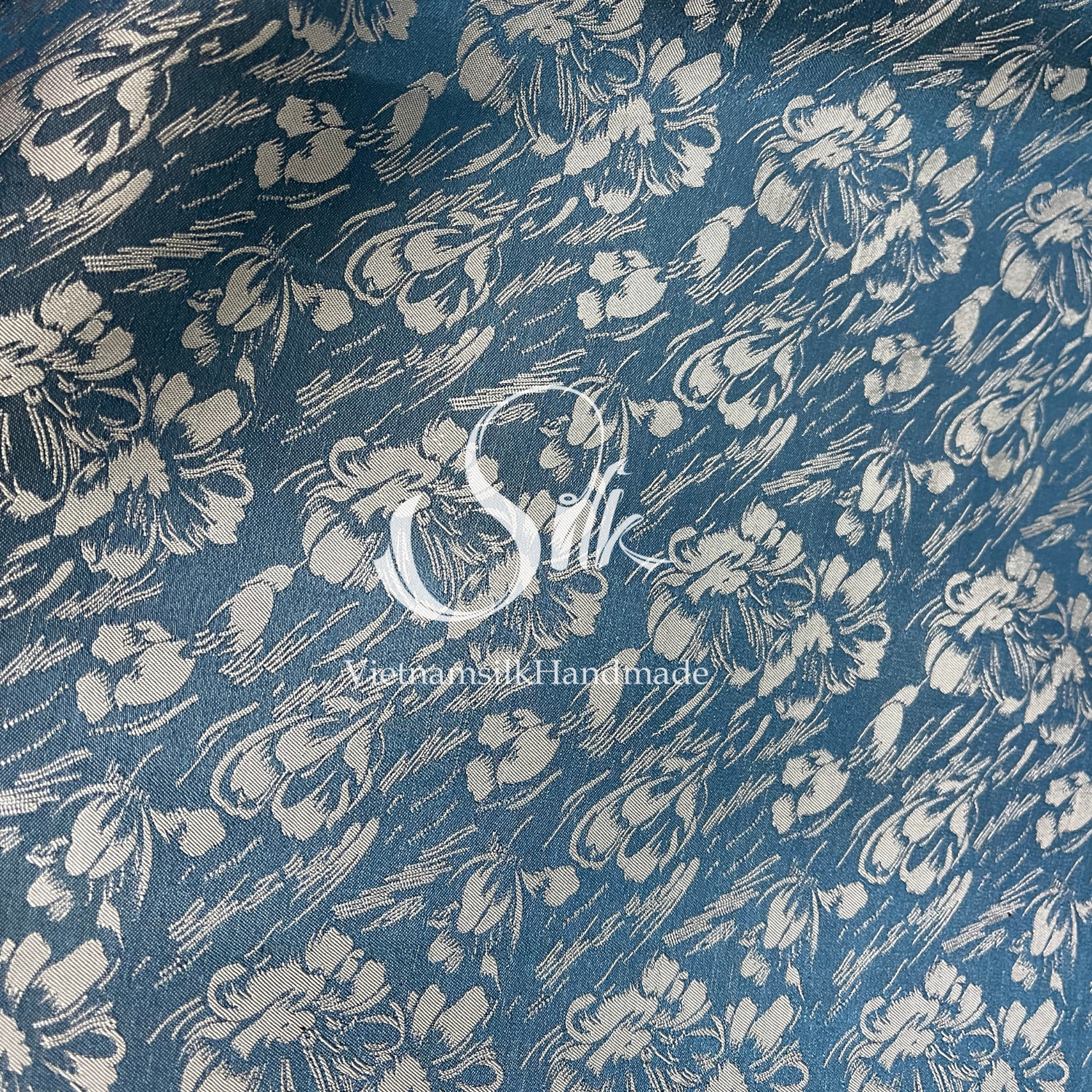 Navy Silk with Gray Flowers -Raining Design - PURE MULBERRY SILK fabric by the yard - Floral Silk -Luxury Silk - Natural silk - Handmade in VietNam