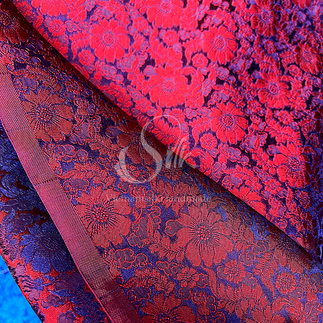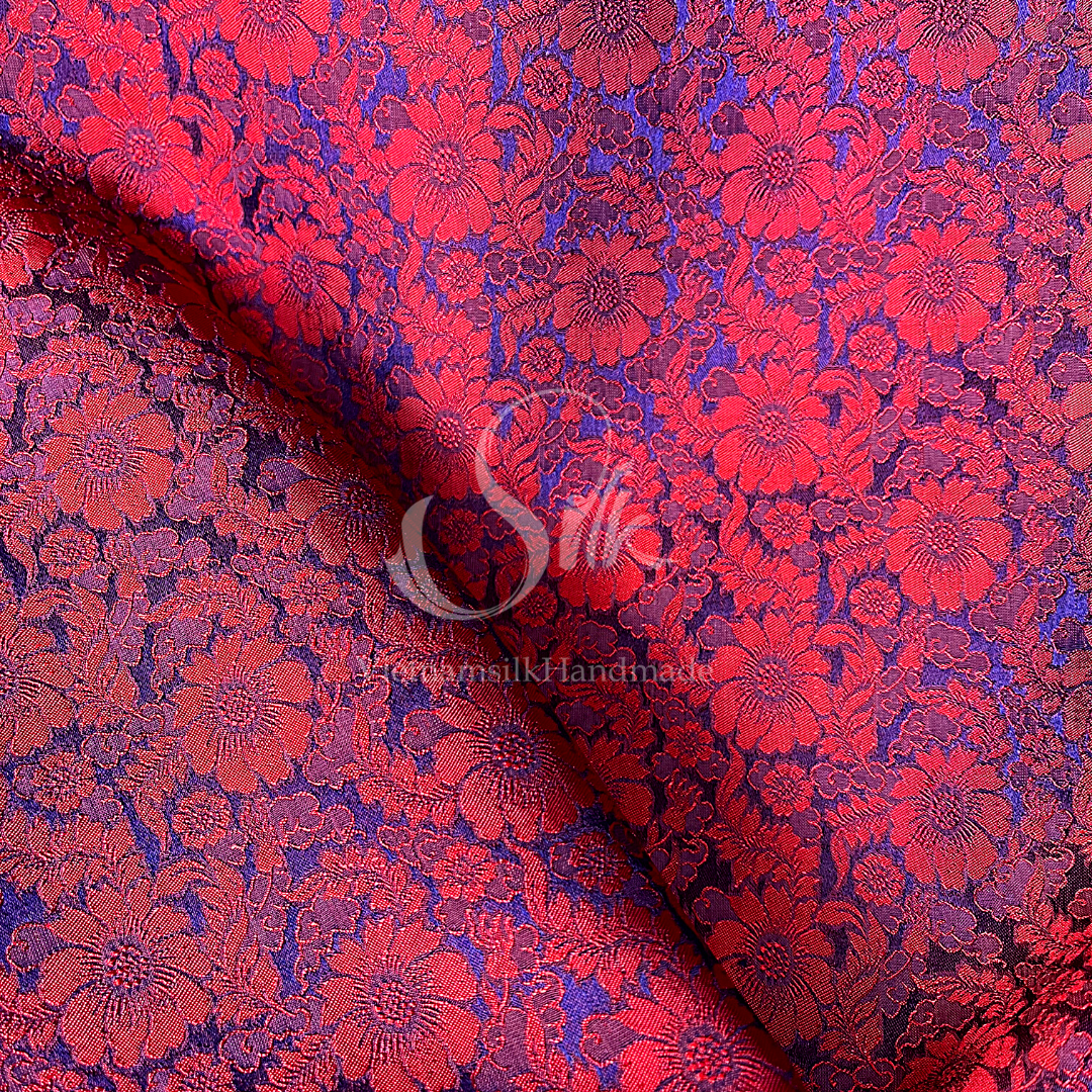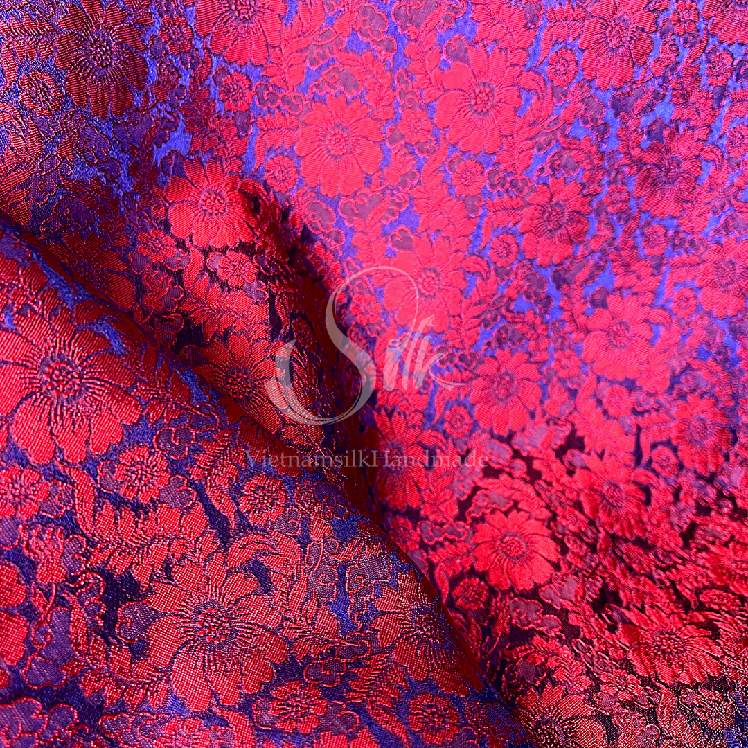 Navy Silk with Red Daisy Flowers - PURE MULBERRY SILK fabric by the yard - Floral Silk -Luxury Silk - Natural silk - Handmade in VietNam