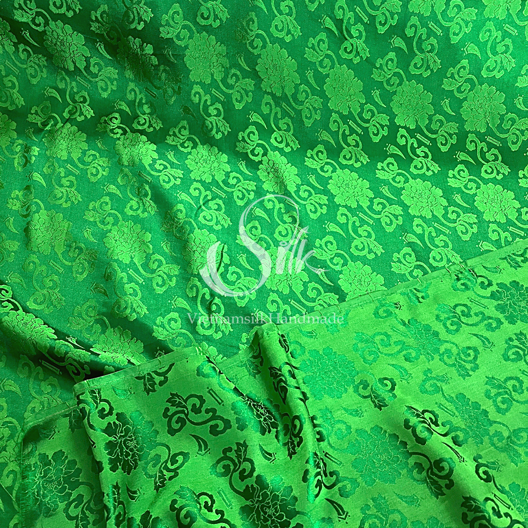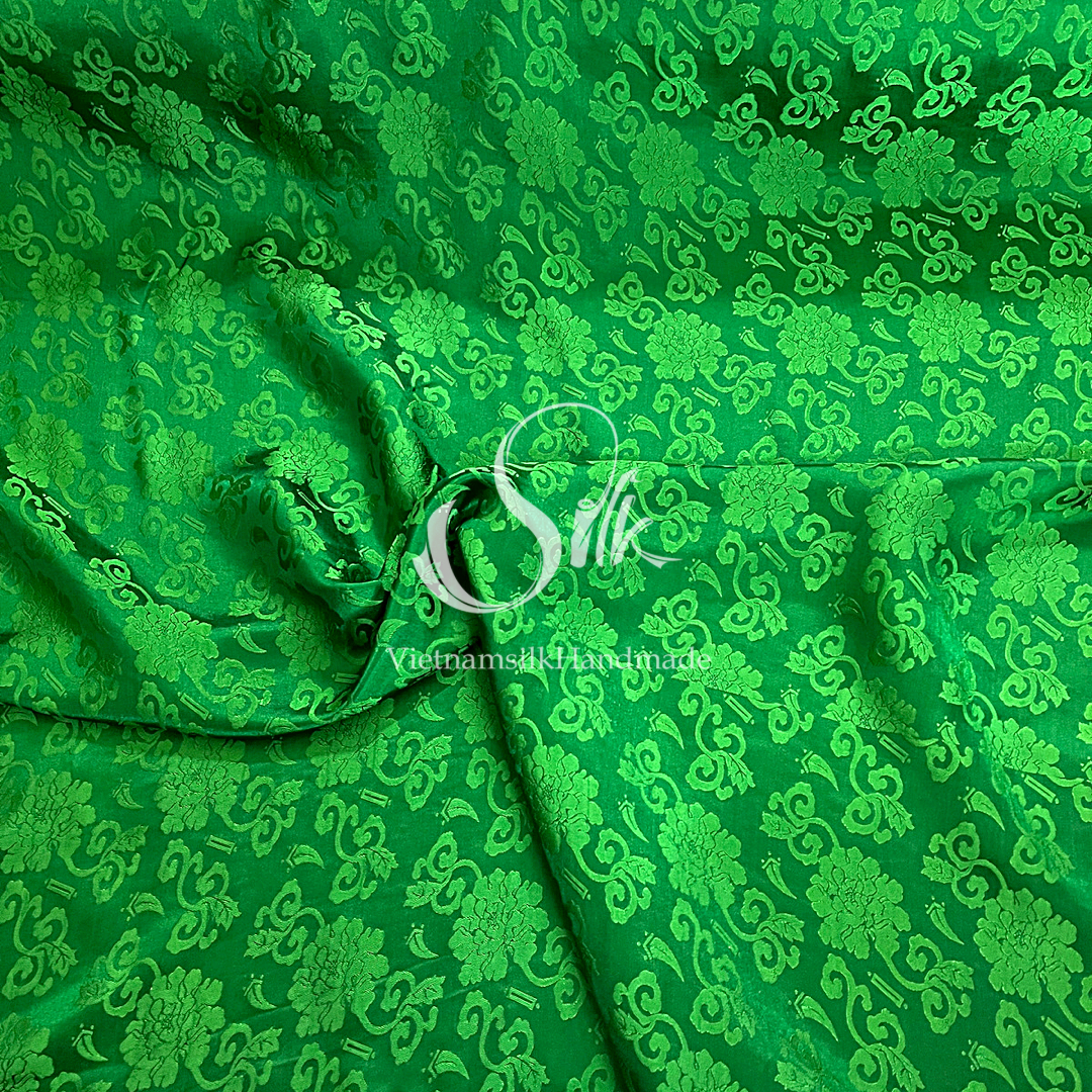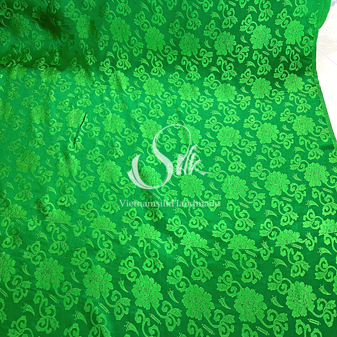 Green Silk with Flowers - PURE MULBERRY SILK fabric by the yard - Floral Silk -Luxury Silk - Natural silk - Handmade in VietNam- Silk with Design
