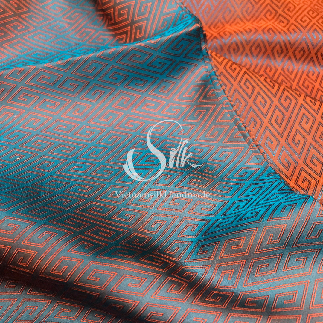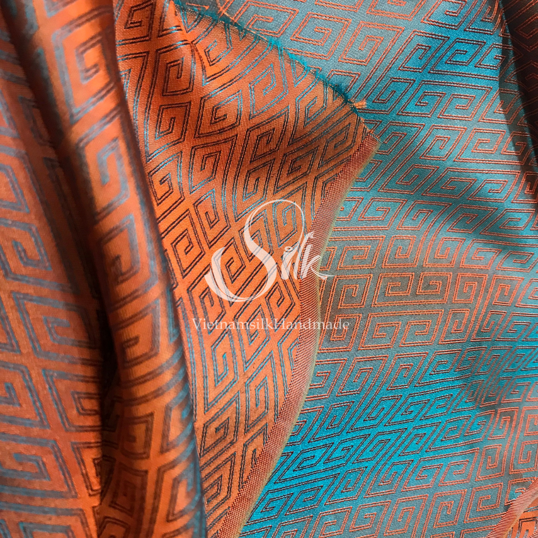 Green Silk with Orange Plaid pattern - PURE MULBERRY SILK fabric by the yard -Luxury Silk - Natural silk - Handmade in VietNam- Silk with Design