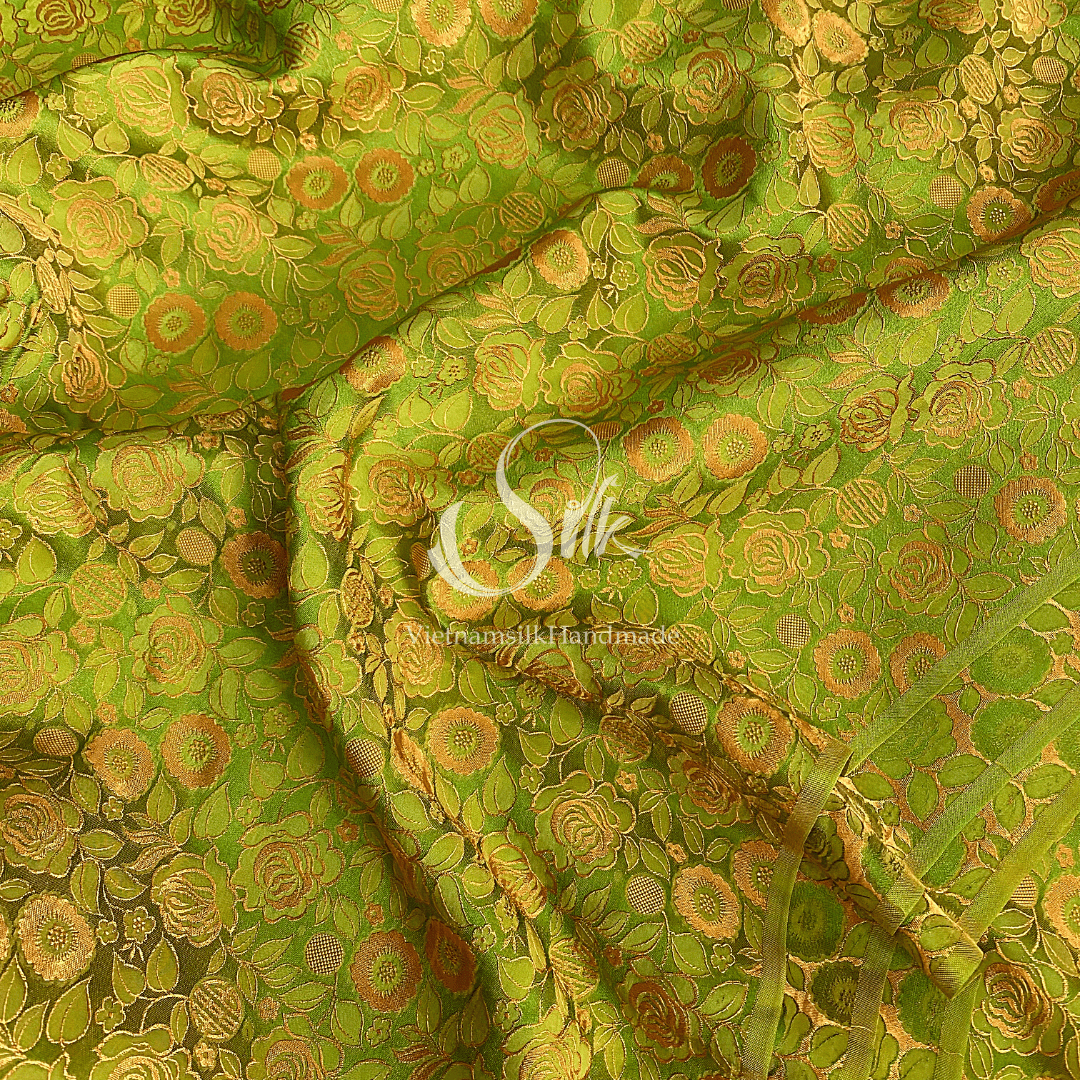 Chartreuse Silk with Yellow Rose Flowers- PURE MULBERRY SILK fabric by the yard - Floral Silk -Luxury Silk - Natural silk - Handmade in VietNam