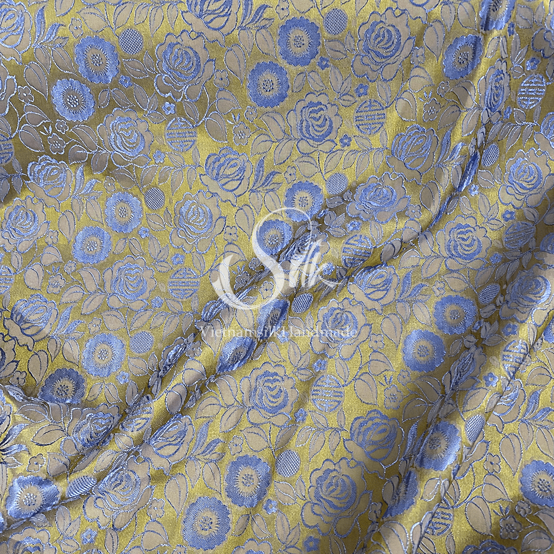 Golden Silk with Gray Flowers - Rose Pattern - PURE MULBERRY SILK fabric by the yard - Floral Silk - Rose Silk -Luxury Silk - Natural silk - Handmade in VietNam- Silk with Design