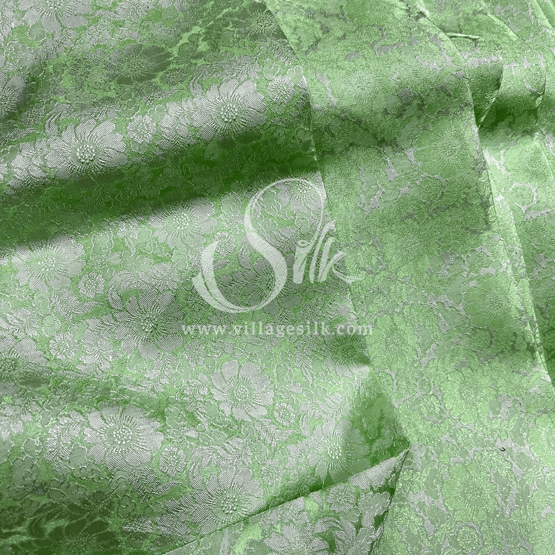 Green Mint Silk with Daisy Flowers - PURE MULBERRY SILK fabric by the yard - Floral Silk -Luxury Silk - Natural silk