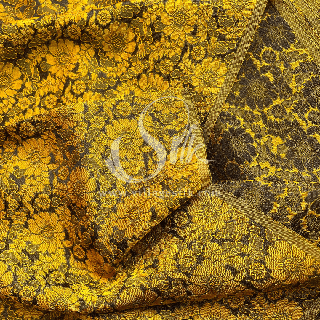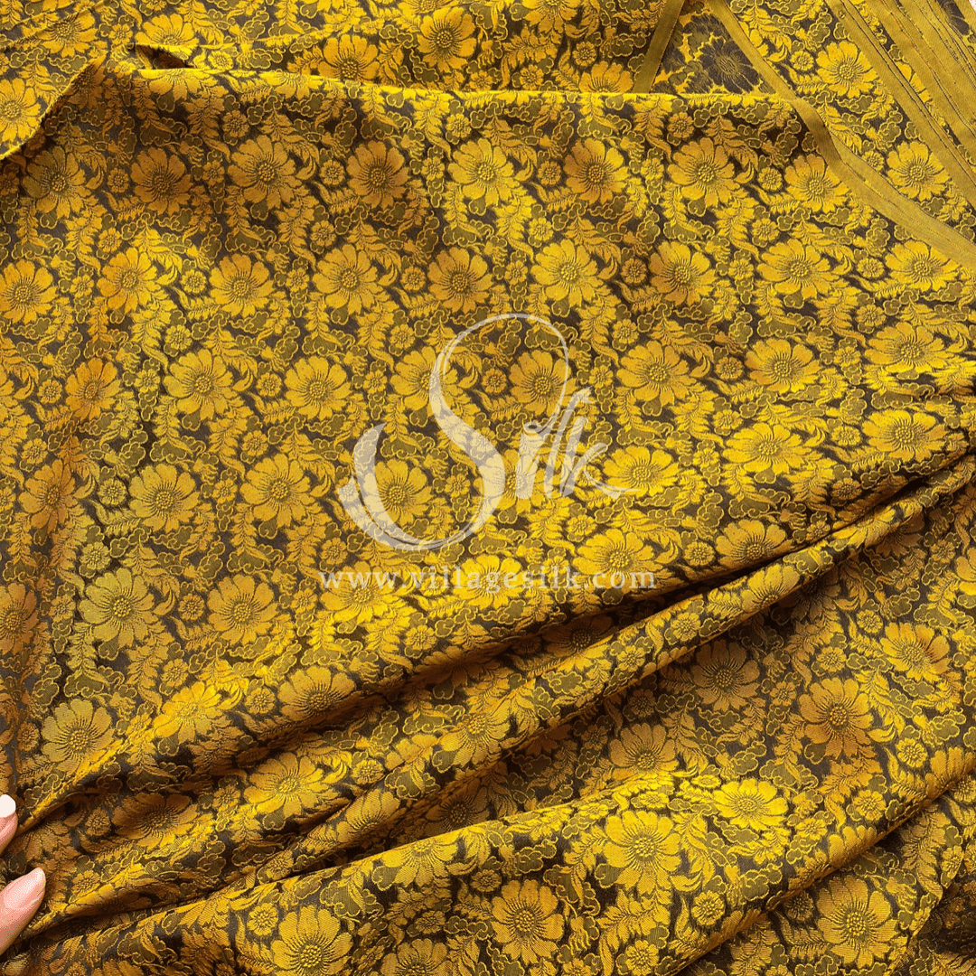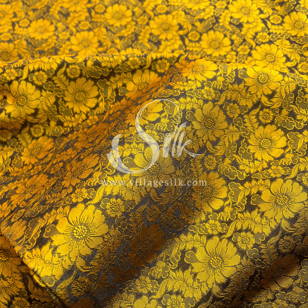 Black Silk with Yellow Daisy Flowers - PURE MULBERRY SILK fabric by the yard - Floral Silk -Luxury Silk - Natural silk
